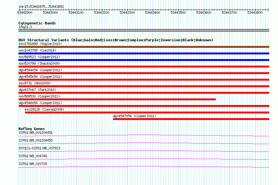 Variant DetailsVariant: nsv569531| Internal ID | 16356940 | | Landmark | | | Location Information | | | Cytoband | 15q21.3 | | Allele length | | Assembly | Allele length | | hg38 | 978 | | hg19 | 978 | | hg18 | 978 |