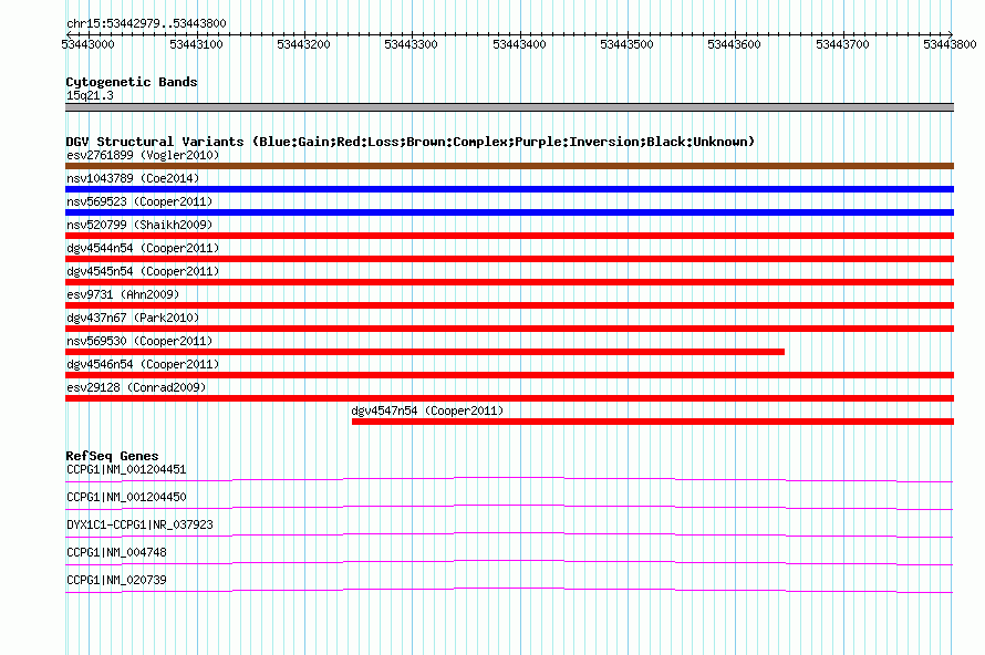 Variant DetailsVariant: nsv569533| Internal ID | 16356942 | | Landmark | | | Location Information | | | Cytoband | 15q21.3 | | Allele length | | Assembly | Allele length | | hg38 | 822 | | hg19 | 822 | | hg18 | 822 |