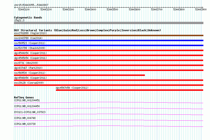 Variant DetailsVariant: nsv569535| Internal ID | 16356944 | | Landmark | | | Location Information | | | Cytoband | 15q21.3 | | Allele length | | Assembly | Allele length | | hg38 | 853 | | hg19 | 853 | | hg18 | 853 |