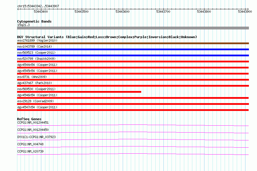 Variant DetailsVariant: nsv569537| Internal ID | 16356946 | | Landmark | | | Location Information | | | Cytoband | 15q21.3 | | Allele length | | Assembly | Allele length | | hg38 | 566 | | hg19 | 566 | | hg18 | 566 |