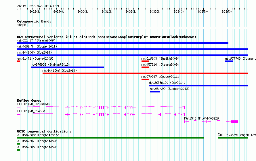 | Variant Type | CNV gain | Copy Number | | Allele State | | Allele Origin | | Probe Count | | Validation Flag | | Merged Status | M | Merged Variants | dgv4682n54 | Supporting Variants | nssv847560 | Samples | | Known Genes | EFTUD1, FAM154B | Method | SNP array | Analysis | Illumina SNP array copy number analysis | Platform | Not reported | Comments | | Reference | Cooper_et_al_2011 | Pubmed ID | 21841781 | Accession Number(s) | nsv570246