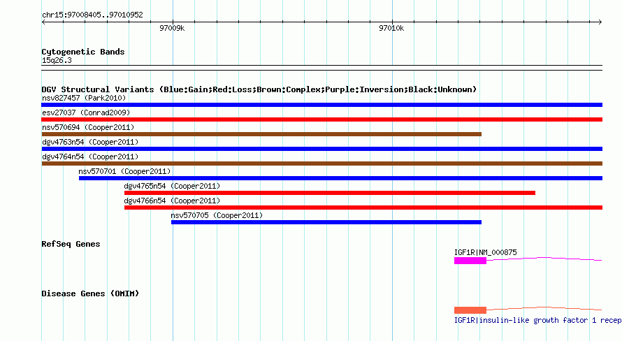 | | Variant Type | CNV gain+loss | | Copy Number | | | Allele State | | | Allele Origin | | | Probe Count | | | Validation Flag | | | Merged Status | M | | Merged Variants | dgv4764n54 | | Supporting Variants | nssv849594, nssv849597, nssv849595, nssv849593, nssv849596, nssv849592 | | Samples | | | Known Genes | IGF1R | | Method | SNP array | | Analysis | Illumina SNP array copy number analysis | | Platform | Not reported | | Comments | | | Reference | Cooper_et_al_2011 | | Pubmed ID | 21841781 | | Accession Number(s) | nsv570696
