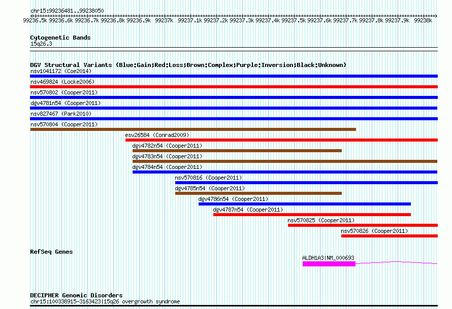 | | Variant Type | CNV gain | | Copy Number | | | Allele State | | | Allele Origin | | | Probe Count | | | Validation Flag | | | Merged Status | M | | Merged Variants | dgv4781n54 | | Supporting Variants | nssv850957, nssv850956 | | Samples | | | Known Genes | ALDH1A3 | | Method | SNP array | | Analysis | Illumina SNP array copy number analysis | | Platform | Not reported | | Comments | | | Reference | Cooper_et_al_2011 | | Pubmed ID | 21841781 | | Accession Number(s) | nsv570806