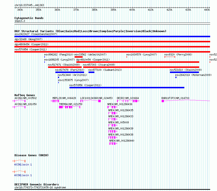 Variant DetailsVariant: nsv570955| Internal ID | 16358364 | | Landmark | | | Location Information | | | Cytoband | 16p13.3 | | Allele length | | Assembly | Allele length | | hg38 | 104319 | | hg19 | 104319 | | hg18 | 104319 |