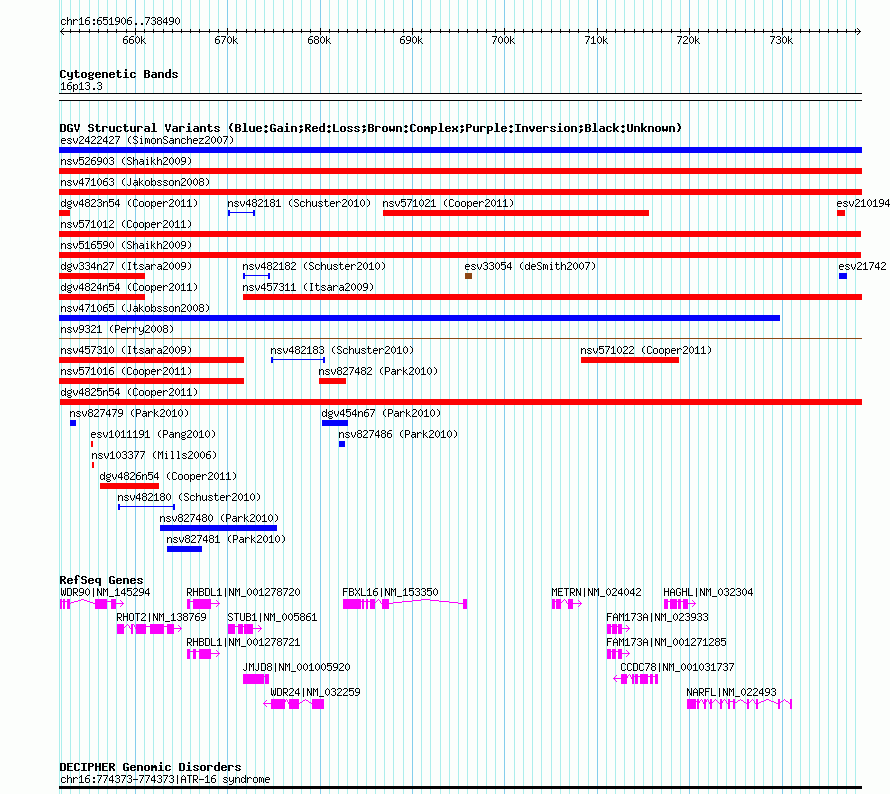 Variant DetailsVariant: nsv571017| Internal ID | 16011740 | | Landmark | | | Location Information | | | Cytoband | 16p13.3 | | Allele length | | Assembly | Allele length | | hg38 | 86585 | | hg19 | 86585 | | hg18 | 86585 |