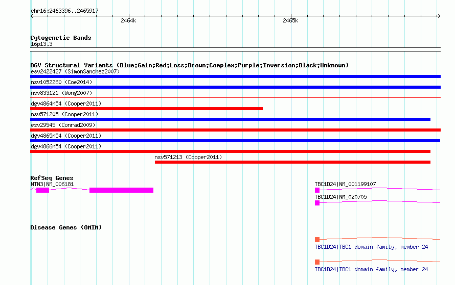| | Variant Type | CNV gain | | Copy Number | | | Allele State | | | Allele Origin | | | Probe Count | | | Validation Flag | | | Merged Status | M | | Merged Variants | dgv4865n54 | | Supporting Variants | nssv852103 | | Samples | | | Known Genes | NTN3, TBC1D24 | | Method | SNP array | | Analysis | Illumina SNP array copy number analysis | | Platform | Not reported | | Comments | | | Reference | Cooper_et_al_2011 | | Pubmed ID | 21841781 | | Accession Number(s) | nsv571211