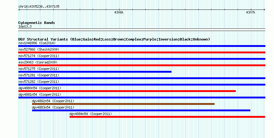 Variant DetailsVariant: nsv571279| Internal ID | 16358688 | | Landmark | | | Location Information | | | Cytoband | 16p13.3 | | Allele length | | Assembly | Allele length | | hg38 | 1870 | | hg19 | 1870 | | hg18 | 1870 |
