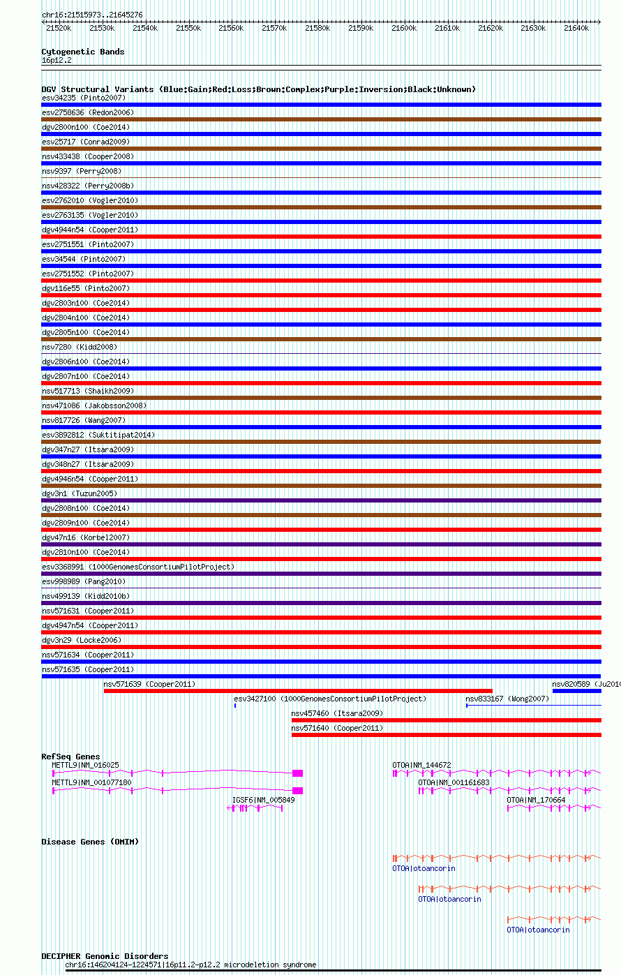 | Variant Type | CNV gain | Copy Number | | Allele State | | Allele Origin | | Probe Count | | Validation Flag | | Merged Status | M | Merged Variants | | Supporting Variants | nssv853107 | Samples | | Known Genes | IGSF6, METTL9, OTOA | Method | SNP array | Analysis | Illumina SNP array copy number analysis | Platform | Not reported | Comments | | Reference | Cooper_et_al_2011 | Pubmed ID | 21841781 | Accession Number(s) | nsv571635