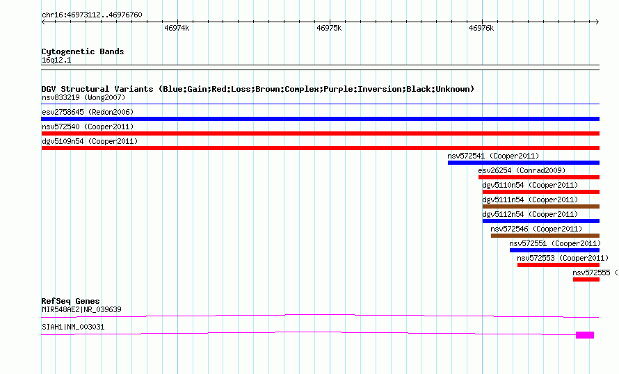 | | Variant Type | CNV loss | | Copy Number | | | Allele State | | | Allele Origin | | | Probe Count | | | Validation Flag | | | Merged Status | M | | Merged Variants | dgv5109n54 | | Supporting Variants | nssv856650 | | Samples | | | Known Genes | MIR548AE2, SIAH1 | | Method | SNP array | | Analysis | Illumina SNP array copy number analysis | | Platform | Not reported | | Comments | | | Reference | Cooper_et_al_2011 | | Pubmed ID | 21841781 | | Accession Number(s) | nsv572538