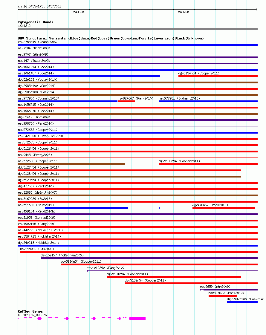 | | Variant Type | CNV loss | | Copy Number | | | Allele State | | | Allele Origin | | | Probe Count | | | Validation Flag | | | Merged Status | M | | Merged Variants | dgv5126n54 | | Supporting Variants | nssv857526, nssv857531, nssv857524, nssv857533, nssv857534, nssv857530, nssv857527, nssv857529, nssv857532, nssv857525, nssv857528, nssv857523 | | Samples | | | Known Genes | CES1P1 | | Method | SNP array | | Analysis | Illumina SNP array copy number analysis | | Platform | Not reported | | Comments | | | Reference | Cooper_et_al_2011 | | Pubmed ID | 21841781 | | Accession Number(s) | nsv572649