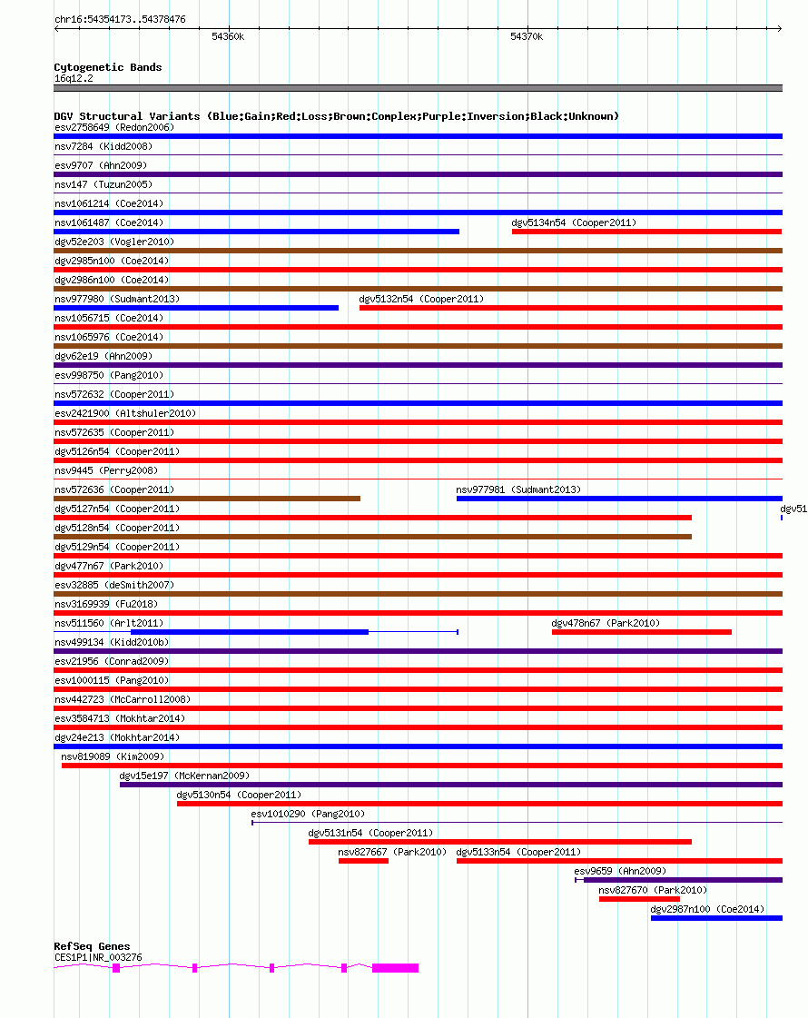 Variant DetailsVariant: nsv572650| Internal ID | 16360059 | | Landmark | | | Location Information | | | Cytoband | 16q12.2 | | Allele length | | Assembly | Allele length | | hg38 | 24304 | | hg19 | 24304 | | hg18 | 24304 |