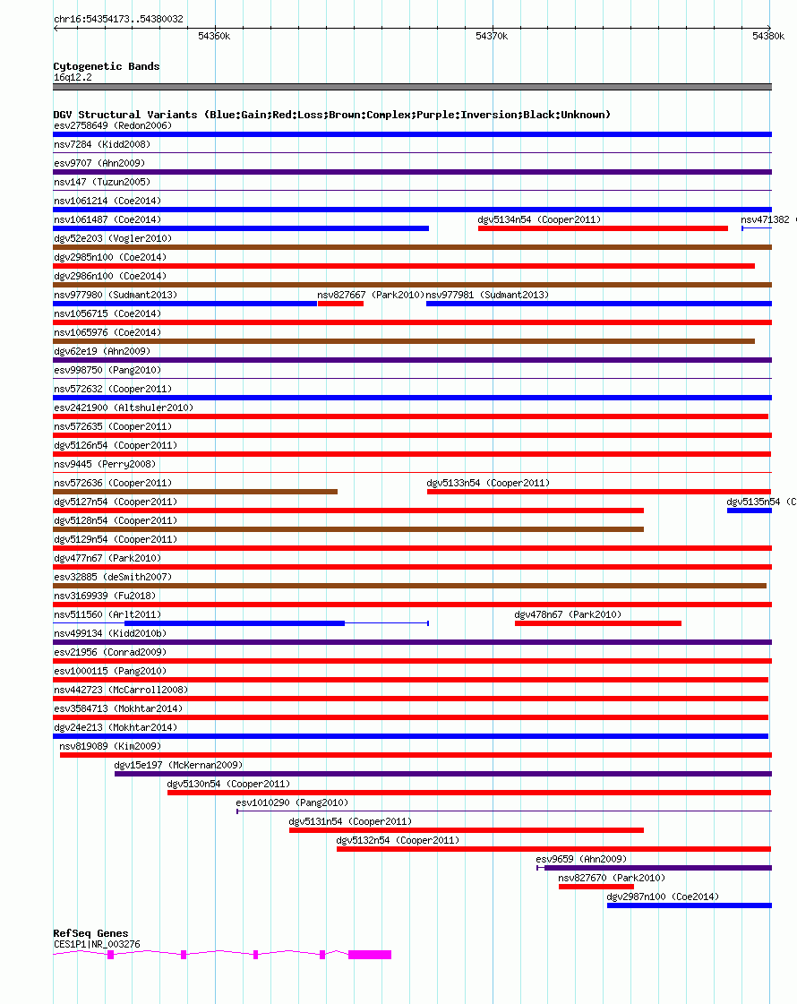 | | Variant Type | CNV loss | | Copy Number | | | Allele State | | | Allele Origin | | | Probe Count | | | Validation Flag | | | Merged Status | M | | Merged Variants | dgv5126n54 | | Supporting Variants | nssv857551, nssv857552 | | Samples | | | Known Genes | CES1P1 | | Method | SNP array | | Analysis | Illumina SNP array copy number analysis | | Platform | Not reported | | Comments | | | Reference | Cooper_et_al_2011 | | Pubmed ID | 21841781 | | Accession Number(s) | nsv572651