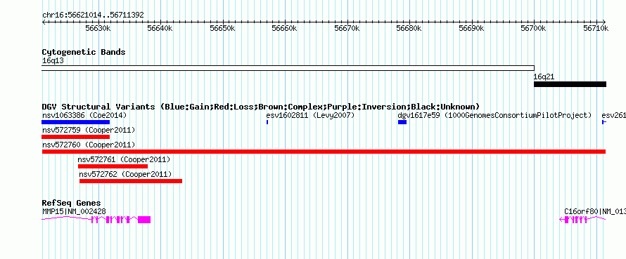 | Variant Type | CNV loss | Copy Number | | Allele State | | Allele Origin | | Probe Count | | Validation Flag | | Merged Status | M | Merged Variants | | Supporting Variants | nssv858145 | Samples | | Known Genes | C16orf80, MMP15 | Method | SNP array | Analysis | Illumina SNP array copy number analysis | Platform | Not reported | Comments | | Reference | Cooper_et_al_2011 | Pubmed ID | 21841781 | Accession Number(s) | nsv572760