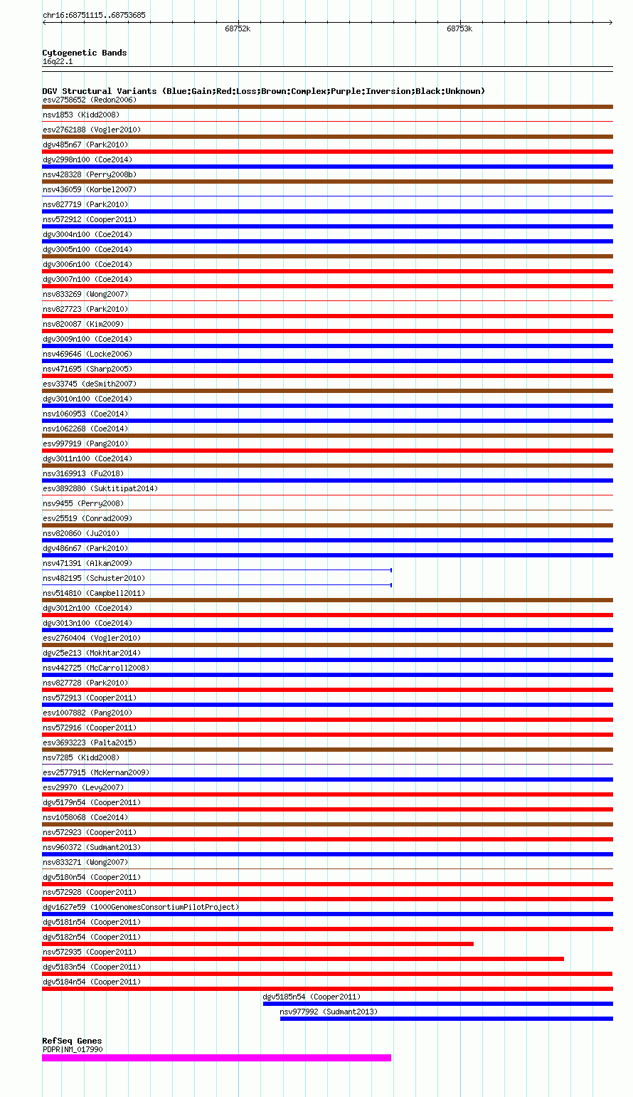 Variant DetailsVariant: nsv572940| Internal ID | 16360349 | | Landmark | | | Location Information | | | Cytoband | 16q22.1 | | Allele length | | Assembly | Allele length | | hg38 | 2571 | | hg19 | 2571 | | hg18 | 2571 |
