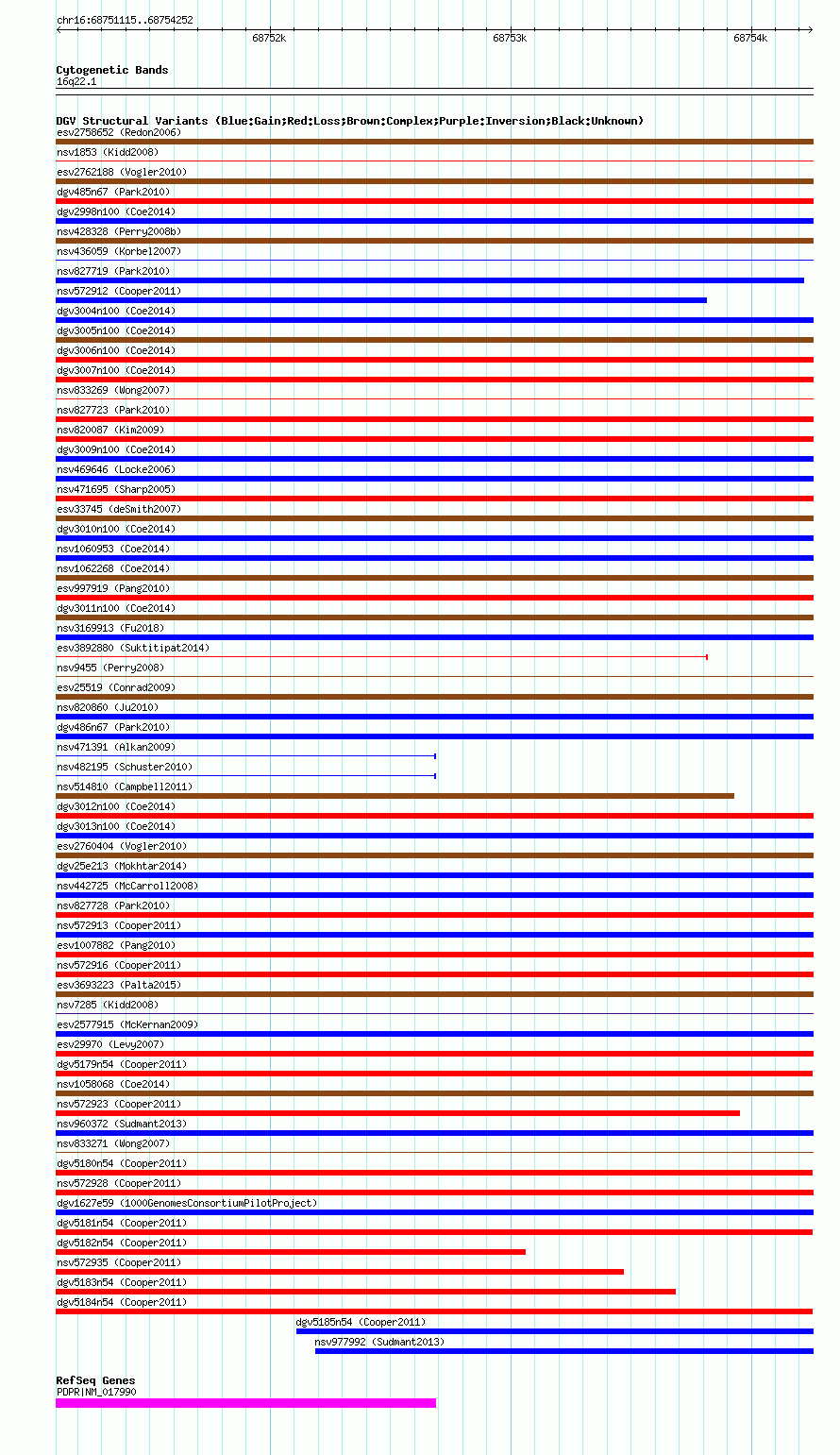 Variant DetailsVariant: nsv572941| Internal ID | 16360350 | | Landmark | | | Location Information | | | Cytoband | 16q22.1 | | Allele length | | Assembly | Allele length | | hg38 | 3138 | | hg19 | 3138 | | hg18 | 3138 |