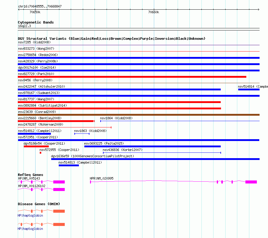 Variant DetailsVariant: nsv572951| Internal ID | 16360360 | | Landmark | | | Location Information | | | Cytoband | 16q22.2 | | Allele length | | Assembly | Allele length | | hg38 | 20293 | | hg19 | 20293 | | hg18 | 20293 |