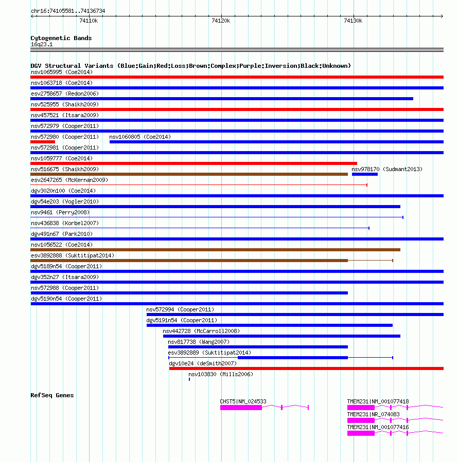 Variant DetailsVariant: nsv572990| Internal ID | 16013713 | | Landmark | | | Location Information | | | Cytoband | 16q23.1 | | Allele length | | Assembly | Allele length | | hg38 | 31154 | | hg19 | 31154 | | hg18 | 31154 |