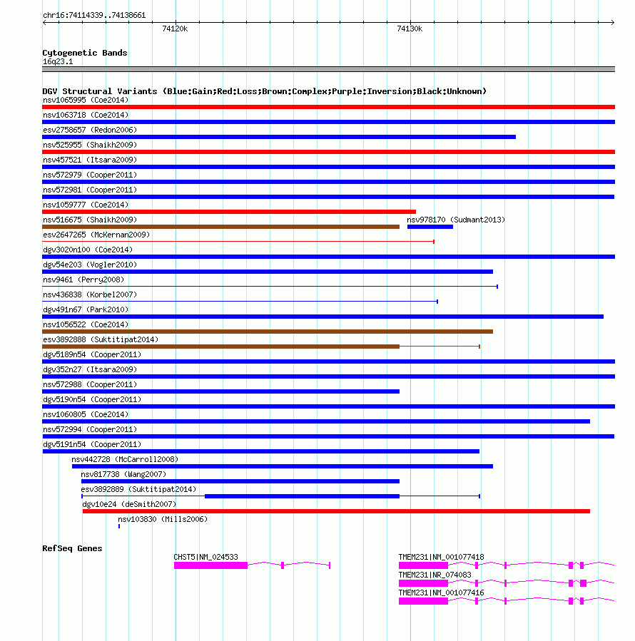 Variant DetailsVariant: nsv572994| Internal ID | 16013717 | | Landmark | | | Location Information | | | Cytoband | 16q23.1 | | Allele length | | Assembly | Allele length | | hg38 | 24323 | | hg19 | 24323 | | hg18 | 24323 |