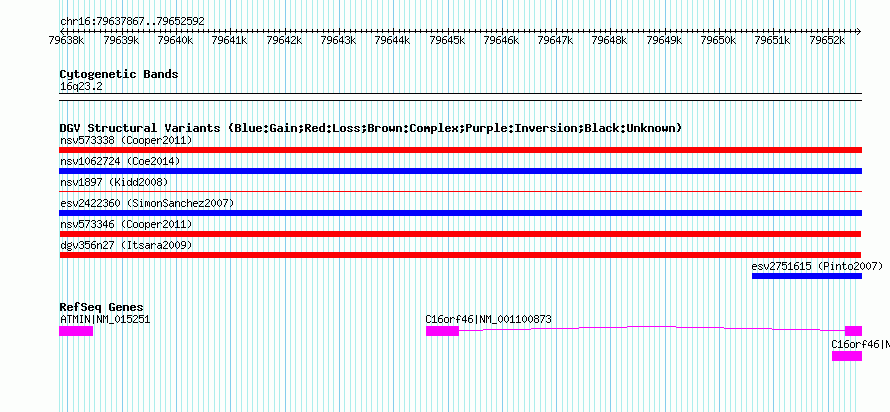 Variant DetailsVariant: nsv573346| Internal ID | 16014069 | | Landmark | | | Location Information | | | Cytoband | 16q23.2 | | Allele length | | Assembly | Allele length | | hg38 | 14726 | | hg19 | 14726 | | hg18 | 14726 |