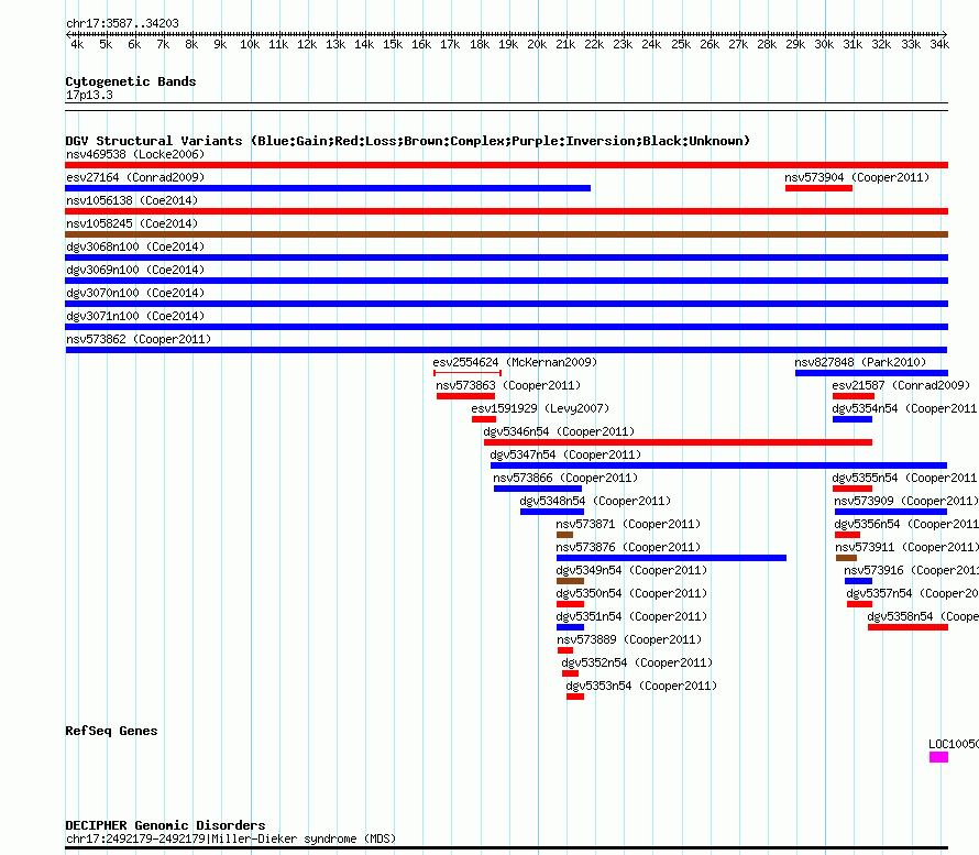 Variant DetailsVariant: nsv573862| Internal ID | 16014585 | | Landmark | | | Location Information | | | Cytoband | 17p13.3 | | Allele length | | Assembly | Allele length | | hg38 | 30619 | | hg19 | 30617 | | hg18 | 30617 |