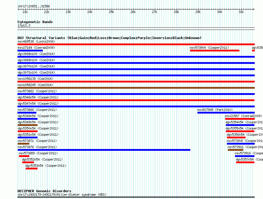 Variant DetailsVariant: nsv573887| Internal ID | 16014610 | | Landmark | | | Location Information | | | Cytoband | 17p13.3 | | Allele length | | Assembly | Allele length | | hg38 | 10936 | | hg19 | 10936 | | hg18 | 10936 |