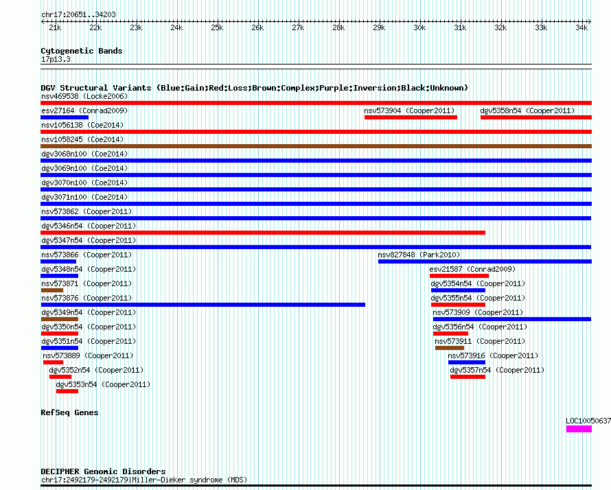 Variant DetailsVariant: nsv573888| Internal ID | 16014611 | | Landmark | | | Location Information | | | Cytoband | 17p13.3 | | Allele length | | Assembly | Allele length | | hg38 | 13553 | | hg19 | 13553 | | hg18 | 13553 |