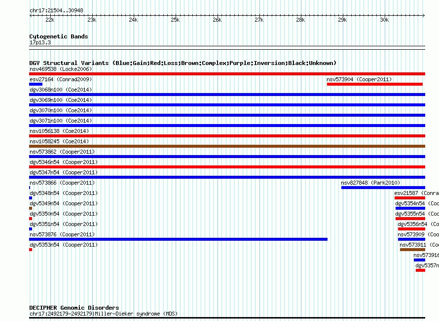 Variant DetailsVariant: nsv573901| Internal ID | 16014624 | | Landmark | | | Location Information | | | Cytoband | 17p13.3 | | Allele length | | Assembly | Allele length | | hg38 | 9445 | | hg19 | 9445 | | hg18 | 9445 |