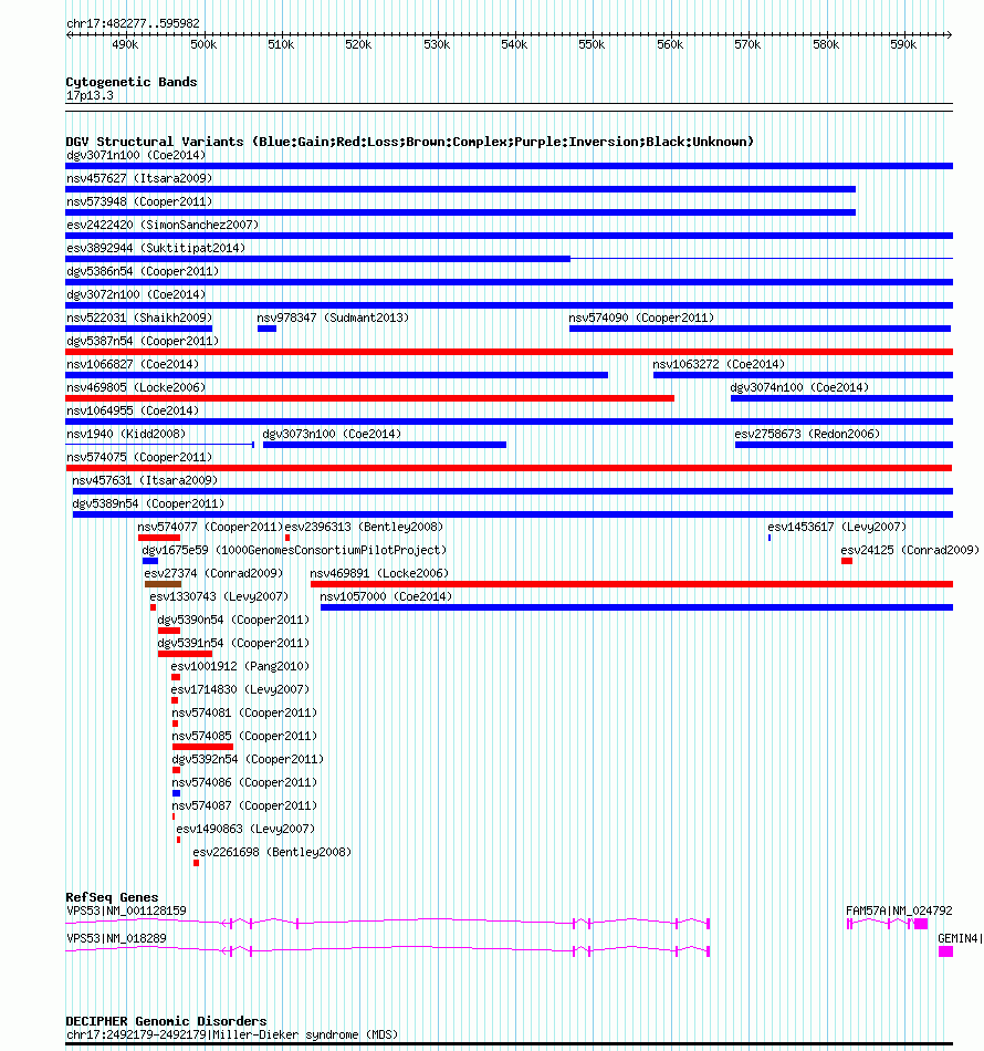 Variant DetailsVariant: nsv574075| Internal ID | 16014798 | | Landmark | | | Location Information | | | Cytoband | 17p13.3 | | Allele length | | Assembly | Allele length | | hg38 | 113706 | | hg19 | 113706 | | hg18 | 113706 |