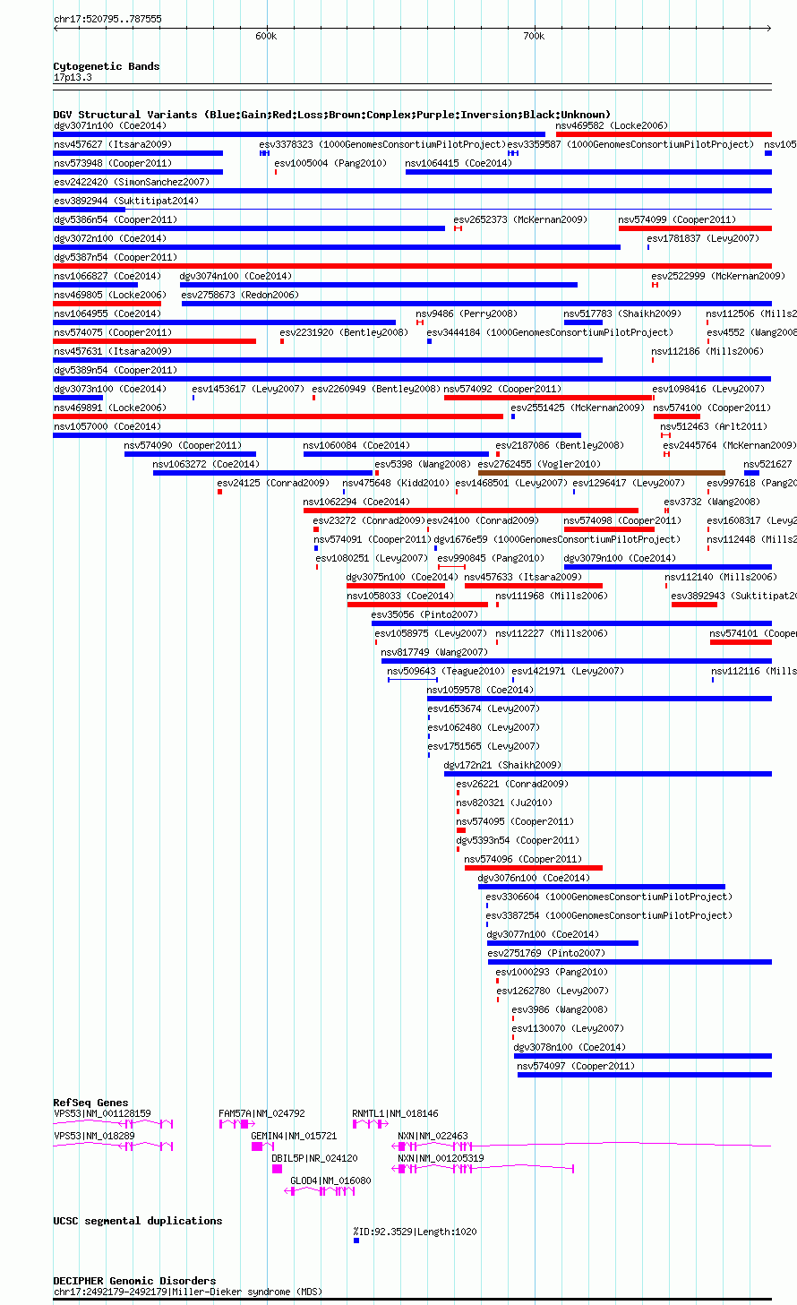 Variant DetailsVariant: nsv574089| Internal ID | 16014812 | | Landmark | | | Location Information | | | Cytoband | 17p13.3 | | Allele length | | Assembly | Allele length | | hg38 | 266761 | | hg19 | 266761 | | hg18 | 266761 |