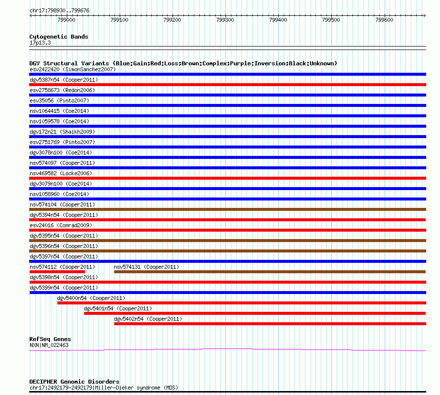 Variant DetailsVariant: nsv574115| Internal ID | 16361524 | | Landmark | | | Location Information | | | Cytoband | 17p13.3 | | Allele length | | Assembly | Allele length | | hg38 | 747 | | hg19 | 747 | | hg18 | 747 |