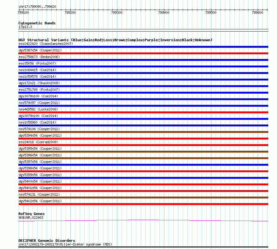 Variant DetailsVariant: nsv574130| Internal ID | 16361539 | | Landmark | | | Location Information | | | Cytoband | 17p13.3 | | Allele length | | Assembly | Allele length | | hg38 | 531 | | hg19 | 531 | | hg18 | 531 |