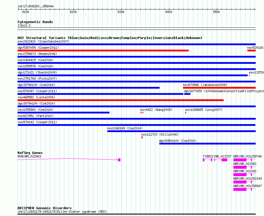 Variant DetailsVariant: nsv574142| Internal ID | 16361551 | | Landmark | | | Location Information | | | Cytoband | 17p13.3 | | Allele length | | Assembly | Allele length | | hg38 | 49762 | | hg19 | 49762 | | hg18 | 49762 |