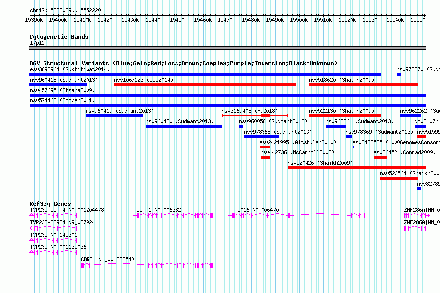 Variant DetailsVariant: nsv574462| Internal ID | 16361871 | | Landmark | | | Location Information | | | Cytoband | 17p12 | | Allele length | | Assembly | Allele length | | hg38 | 164132 | | hg19 | 164132 | | hg18 | 164132 |