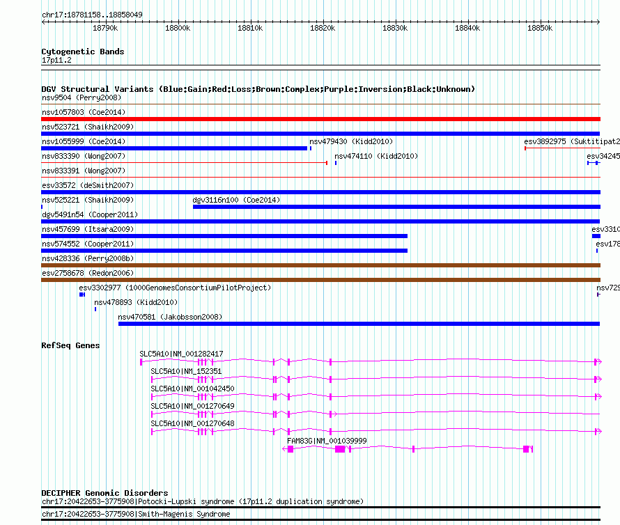Variant DetailsVariant: nsv574553| Internal ID | 16015276 | | Landmark | | | Location Information | | | Cytoband | 17p11.2 | | Allele length | | Assembly | Allele length | | hg38 | 76892 | | hg19 | 76892 | | hg18 | 76892 |