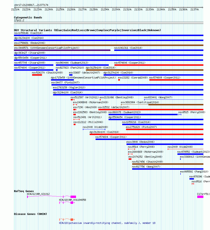 Variant DetailsVariant: nsv574601| Internal ID | 16362010 | | Landmark | | | Location Information | | | Cytoband | 17p11.2 | | Allele length | | Assembly | Allele length | | hg38 | 168409 | | hg19 | 168358 | | hg18 | 168358 |