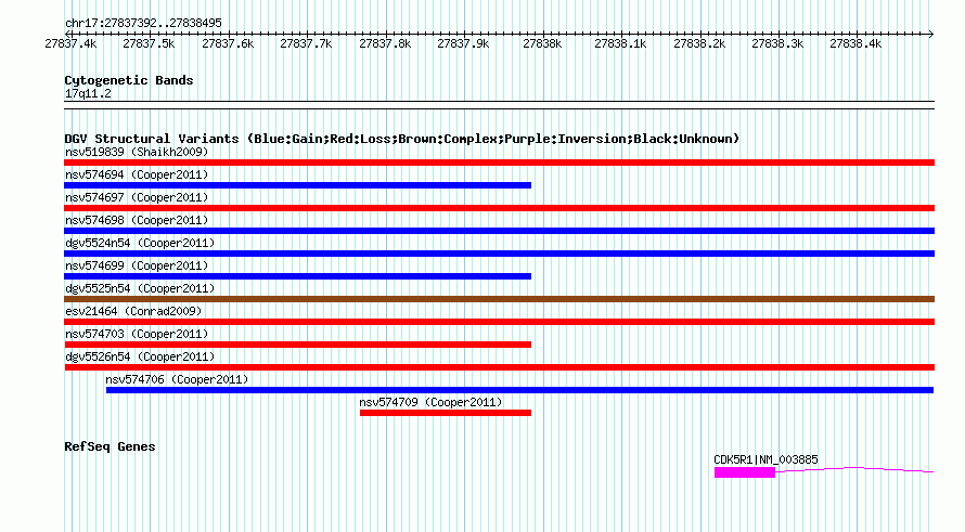 | | Variant Type | CNV gain+loss | | Copy Number | | | Allele State | | | Allele Origin | | | Probe Count | | | Validation Flag | | | Merged Status | M | | Merged Variants | dgv5525n54 | | Supporting Variants | nssv869624, nssv869625 | | Samples | | | Known Genes | CDK5R1 | | Method | SNP array | | Analysis | Illumina SNP array copy number analysis | | Platform | Not reported | | Comments | | | Reference | Cooper_et_al_2011 | | Pubmed ID | 21841781 | | Accession Number(s) | nsv574704