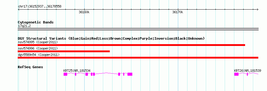 Variant DetailsVariant: nsv574998| Internal ID | 16362407 | | Landmark | | | Location Information | | | Cytoband | 17q21.2 | | Allele length | | Assembly | Allele length | | hg38 | 25622 | | hg19 | 25622 | | hg18 | 25622 |
