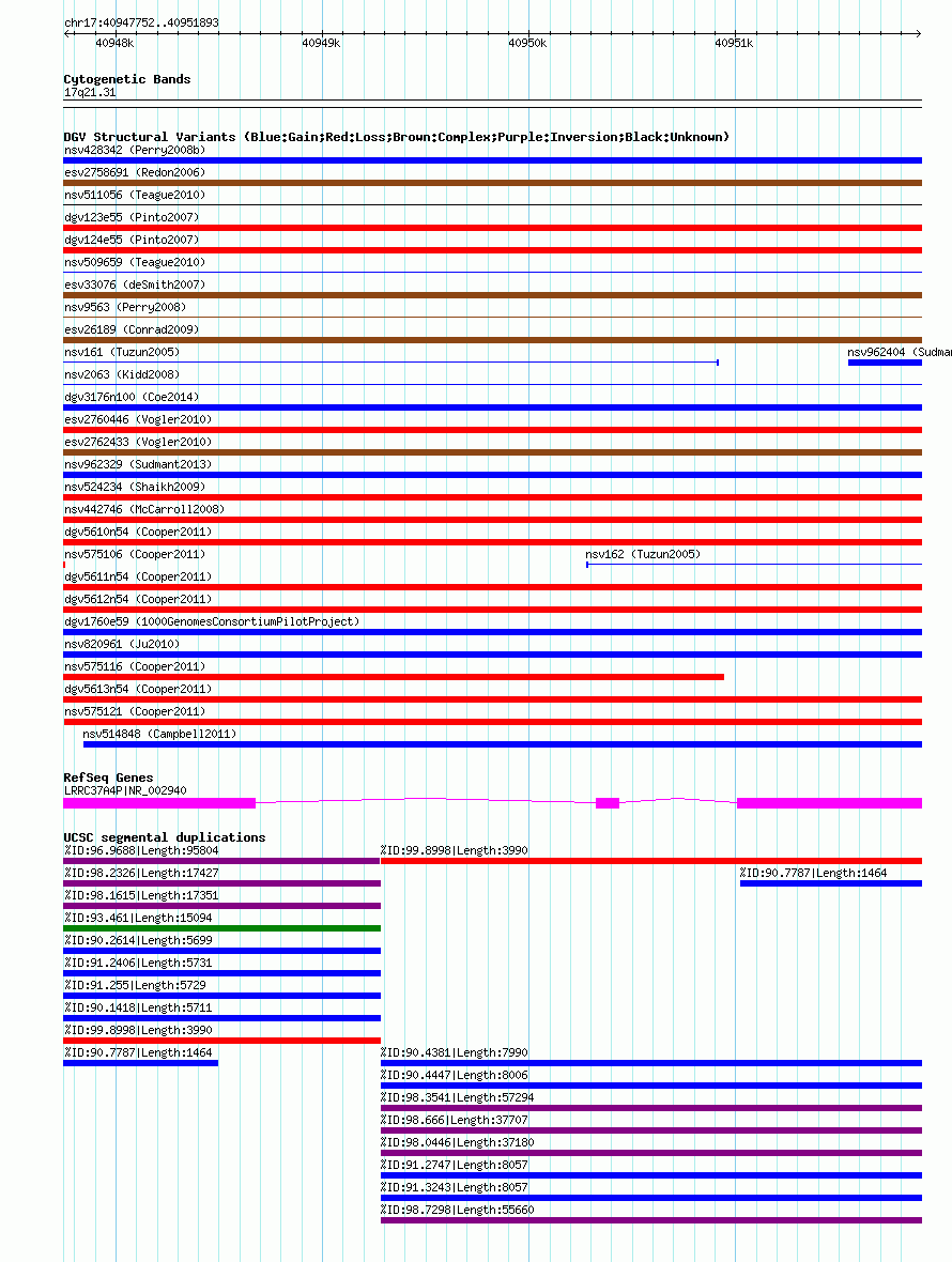 | Variant Type | CNV loss | Copy Number | | Allele State | | Allele Origin | | Probe Count | | Validation Flag | | Merged Status | M | Merged Variants | dgv5613n54 | Supporting Variants | nssv872259, nssv872260 | Samples | | Known Genes | LRRC37A4P | Method | SNP array | Analysis | Illumina SNP array copy number analysis | Platform | Not reported | Comments | | Reference | Cooper_et_al_2011 | Pubmed ID | 21841781 | Accession Number(s) | nsv575118