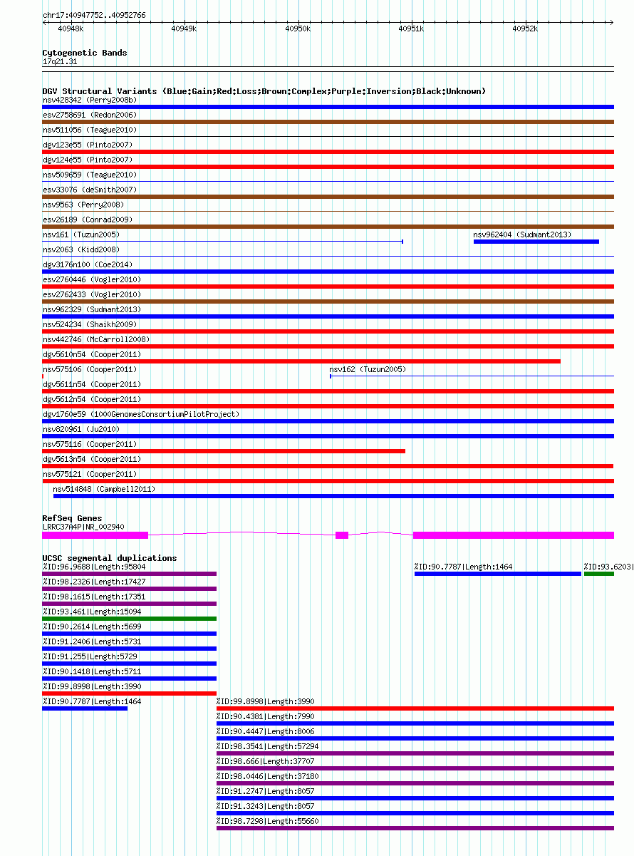 | Variant Type | CNV loss | Copy Number | | Allele State | | Allele Origin | | Probe Count | | Validation Flag | | Merged Status | M | Merged Variants | dgv5613n54 | Supporting Variants | nssv872266, nssv872265, nssv872267, nssv872268, nssv872269 | Samples | | Known Genes | LRRC37A4P | Method | SNP array | Analysis | Illumina SNP array copy number analysis | Platform | Not reported | Comments | | Reference | Cooper_et_al_2011 | Pubmed ID | 21841781 | Accession Number(s) | nsv575120