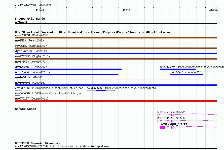 Variant DetailsVariant: nsv575137| Internal ID | 16362546 | | Landmark | | | Location Information | | | Cytoband | 17q21.31 | | Allele length | | Assembly | Allele length | | hg38 | 23193 | | hg19 | 23193 | | hg18 | 23193 |