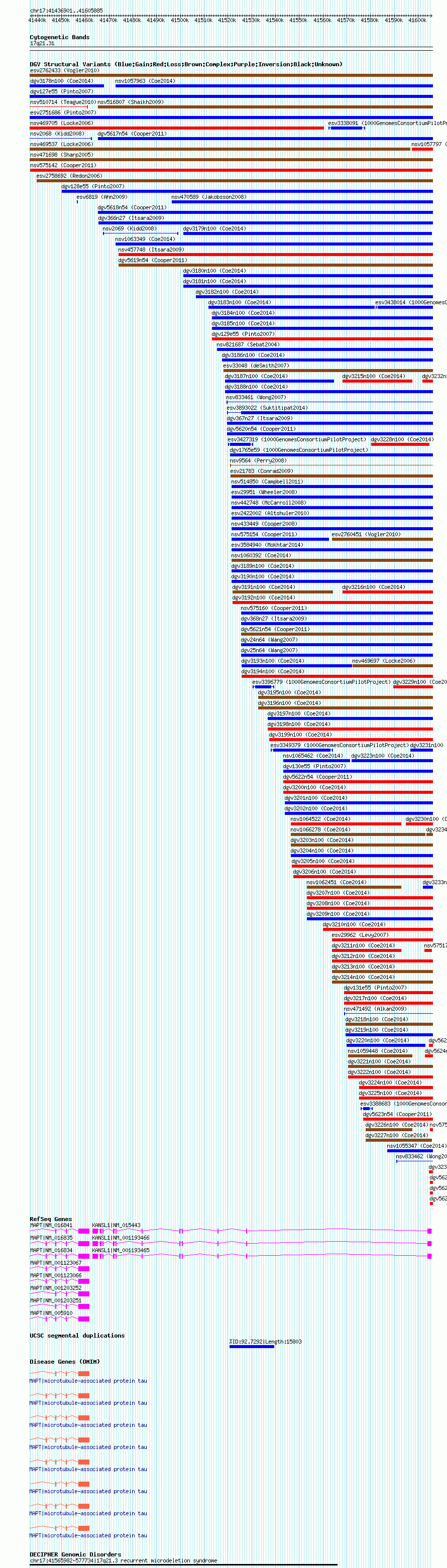 Variant DetailsVariant: nsv575142| Internal ID | 16015865 | | Landmark | | | Location Information | | | Cytoband | 17q21.31 | | Allele length | | Assembly | Allele length | | hg38 | 169045 | | hg19 | 169045 | | hg18 | 168985 |