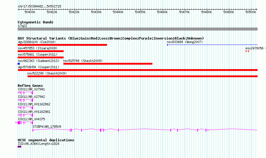 | | Variant Type | CNV loss | | Copy Number | | | Allele State | | | Allele Origin | | | Probe Count | | | Validation Flag | | | Merged Status | M | | Merged Variants | dgv5708n54 | | Supporting Variants | nssv874073 | | Samples | | | Known Genes | COX11, STXBP4 | | Method | SNP array | | Analysis | Illumina SNP array copy number analysis | | Platform | Not reported | | Comments | | | Reference | Cooper_et_al_2011 | | Pubmed ID | 21841781 | | Accession Number(s) | nsv575662