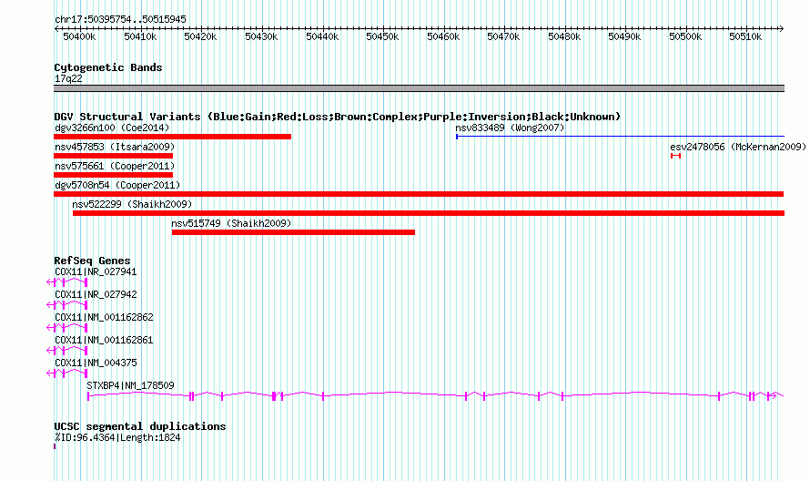 Variant DetailsVariant: nsv575663| Internal ID | 16016386 | | Landmark | | | Location Information | | | Cytoband | 17q22 | | Allele length | | Assembly | Allele length | | hg38 | 120192 | | hg19 | 120192 | | hg18 | 120192 |