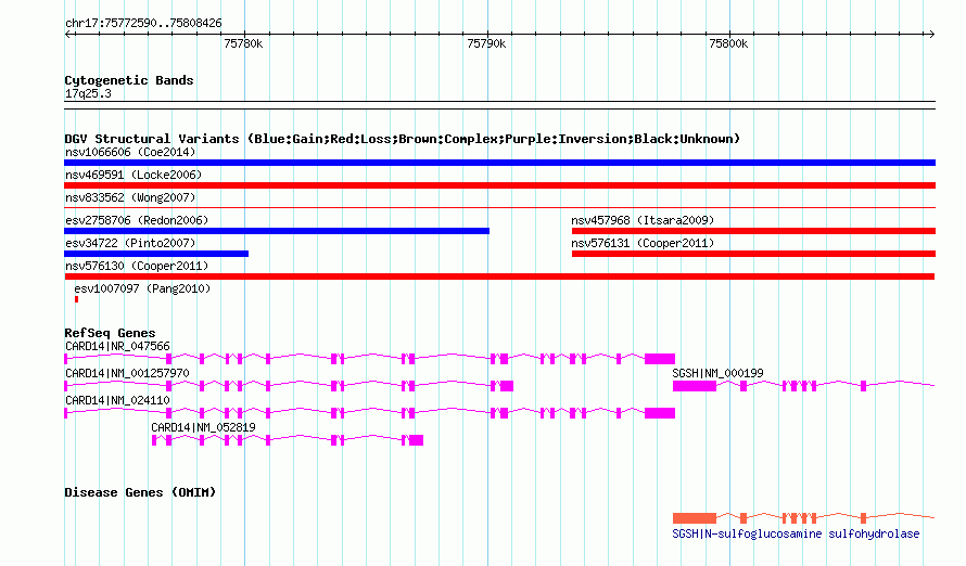 | | Variant Type | CNV loss | | Copy Number | | | Allele State | | | Allele Origin | | | Probe Count | | | Validation Flag | | | Merged Status | M | | Merged Variants | | | Supporting Variants | nssv876898 | | Samples | | | Known Genes | CARD14, SGSH | | Method | SNP array | | Analysis | Illumina SNP array copy number analysis | | Platform | Not reported | | Comments | | | Reference | Cooper_et_al_2011 | | Pubmed ID | 21841781 | | Accession Number(s) | nsv576130
