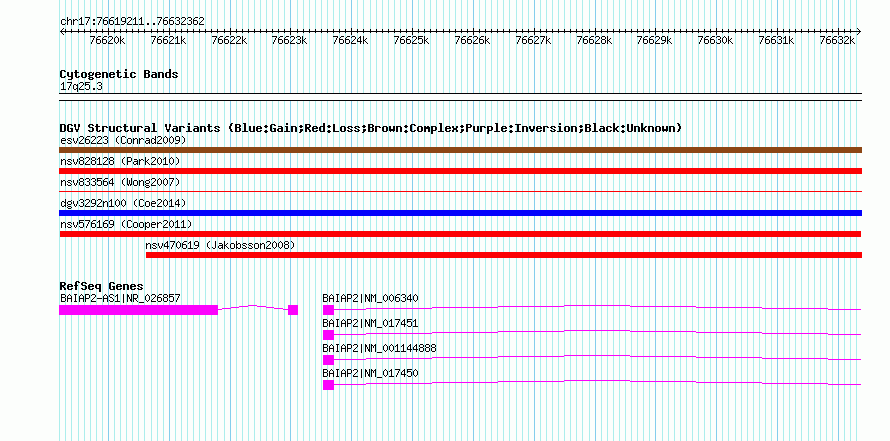 | | Variant Type | CNV loss | | Copy Number | | | Allele State | | | Allele Origin | | | Probe Count | | | Validation Flag | | | Merged Status | M | | Merged Variants | | | Supporting Variants | nssv877106 | | Samples | | | Known Genes | BAIAP2, BAIAP2-AS1 | | Method | SNP array | | Analysis | Illumina SNP array copy number analysis | | Platform | Not reported | | Comments | | | Reference | Cooper_et_al_2011 | | Pubmed ID | 21841781 | | Accession Number(s) | nsv576169
