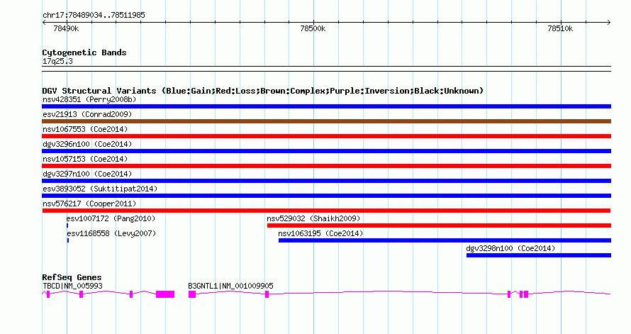 | | Variant Type | CNV loss | | Copy Number | | | Allele State | | | Allele Origin | | | Probe Count | | | Validation Flag | | | Merged Status | M | | Merged Variants | | | Supporting Variants | nssv877270 | | Samples | | | Known Genes | B3GNTL1, TBCD | | Method | SNP array | | Analysis | Illumina SNP array copy number analysis | | Platform | Not reported | | Comments | | | Reference | Cooper_et_al_2011 | | Pubmed ID | 21841781 | | Accession Number(s) | nsv576217