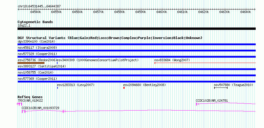 | | Variant Type | CNV gain | | Copy Number | | | Allele State | | | Allele Origin | | | Probe Count | | | Validation Flag | | | Merged Status | M | | Merged Variants | | | Supporting Variants | nssv886477 | | Samples | | | Known Genes | CCDC102B, TMX3 | | Method | SNP array | | Analysis | Illumina SNP array copy number analysis | | Platform | Not reported | | Comments | | | Reference | Cooper_et_al_2011 | | Pubmed ID | 21841781 | | Accession Number(s) | nsv577369