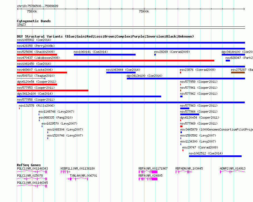 Variant DetailsVariant: nsv577958| Internal ID | 16365367 | | Landmark | | | Location Information | | | Cytoband | 18q23 | | Allele length | | Assembly | Allele length | | hg38 | 205306 | | hg19 | 203189 | | hg18 | 203192 |