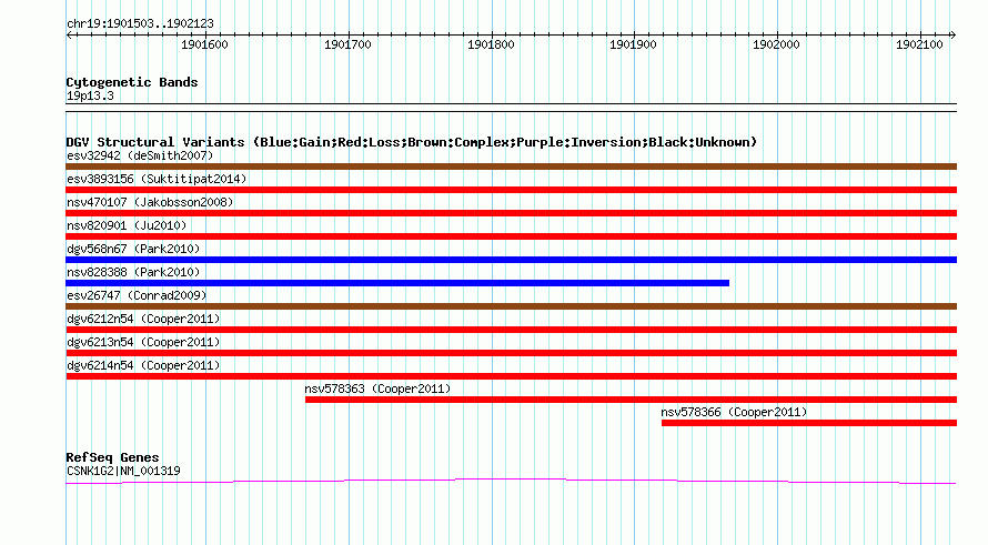 | | Variant Type | CNV loss | | Copy Number | | | Allele State | | | Allele Origin | | | Probe Count | | | Validation Flag | | | Merged Status | M | | Merged Variants | dgv6212n54 | | Supporting Variants | nssv891982, nssv891971, nssv891974, nssv891967, nssv891985, nssv891970, nssv891972, nssv891977, nssv891968, nssv891973, nssv891975, nssv891979, nssv891980, nssv891983, nssv891981, nssv891984, nssv891976, nssv891978, nssv891966, nssv891969 | | Samples | | | Known Genes | CSNK1G2 | | Method | SNP array | | Analysis | Illumina SNP array copy number analysis | | Platform | Not reported | | Comments | | | Reference | Cooper_et_al_2011 | | Pubmed ID | 21841781 | | Accession Number(s) | nsv578349