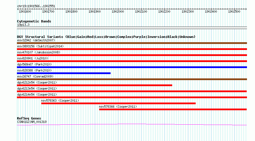 Variant DetailsVariant: nsv578362| Internal ID | 16365771 | | Landmark | | | Location Information | | | Cytoband | 19p13.3 | | Allele length | | Assembly | Allele length | | hg38 | 986 | | hg19 | 986 | | hg18 | 986 |